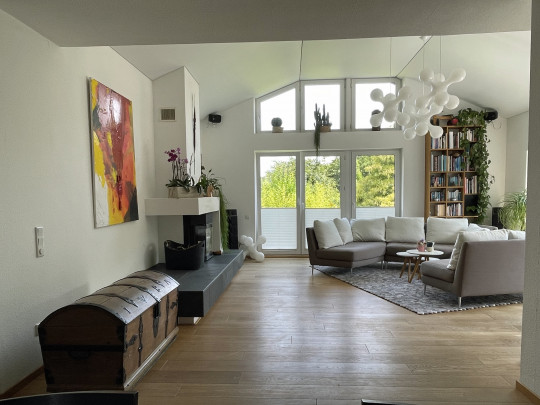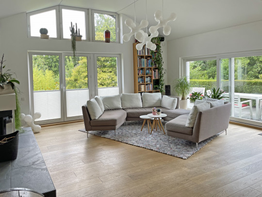 Zentrum und Highlight ist der hohe offene Wohn-/Essbereich (ca. 60 m²) mit Kamin, Licht und Atmosphäre. Der Übergang zur Küche ist offen gestaltet. Es stehen drei Schlafräume zur Verfügung, ein Bad und ein Gäste-WC mit Dusche. Im Souterrain ist der Home-Office-Bereich mit zwei Büros und Platz für Fitness.
